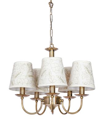 Illuminate your space with this elegant transitional chandelier, perfect for adding sophisticated charm to apartments and smaller dining areas. It features U-shaped arms crafted from mild steel with an antique brass finish. Each arm supports a tapered fabric shade adorned with delicate green thread embroidery, creating a warm and inviting glow. This 5-light fixture hangs gracefully with an additional 10 inches of chain, making it a stylish focal point for any room.
