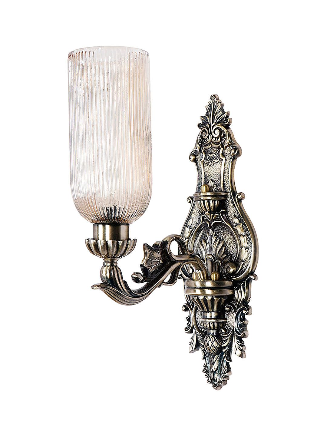 Add a touch of grand traditional elegance to your home with this impressive single-light wall sconce. Crafted from durable aluminum with an antique finish, this fixture features an ornate design. A single upward-facing cylindrical glass shade, boasting a corrugated texture and a lustrous golden finish, provides a warm and inviting glow. This statement piece is perfect for enhancing the ambiance of living rooms, dining areas, hallways, or beside a mirror.