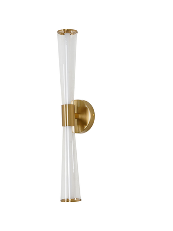 Elevate your bathroom with this sleek and modern vanity light. This light offers a unique and stylish look and features a minimalist design with two parallel cylindrical glass tubes encased in a brass frame. The warm, white 14W LED light provides ample illumination, while the tapered glass tubes create a contemporary aesthetic. Perfect for adding a touch of modern luxury to your bathroom.