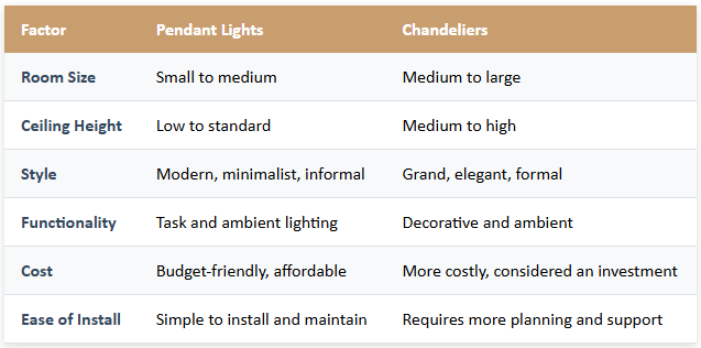 Should you opt for pendant lights or a chandelier? Here's a quick comparison to help you make up your mind: