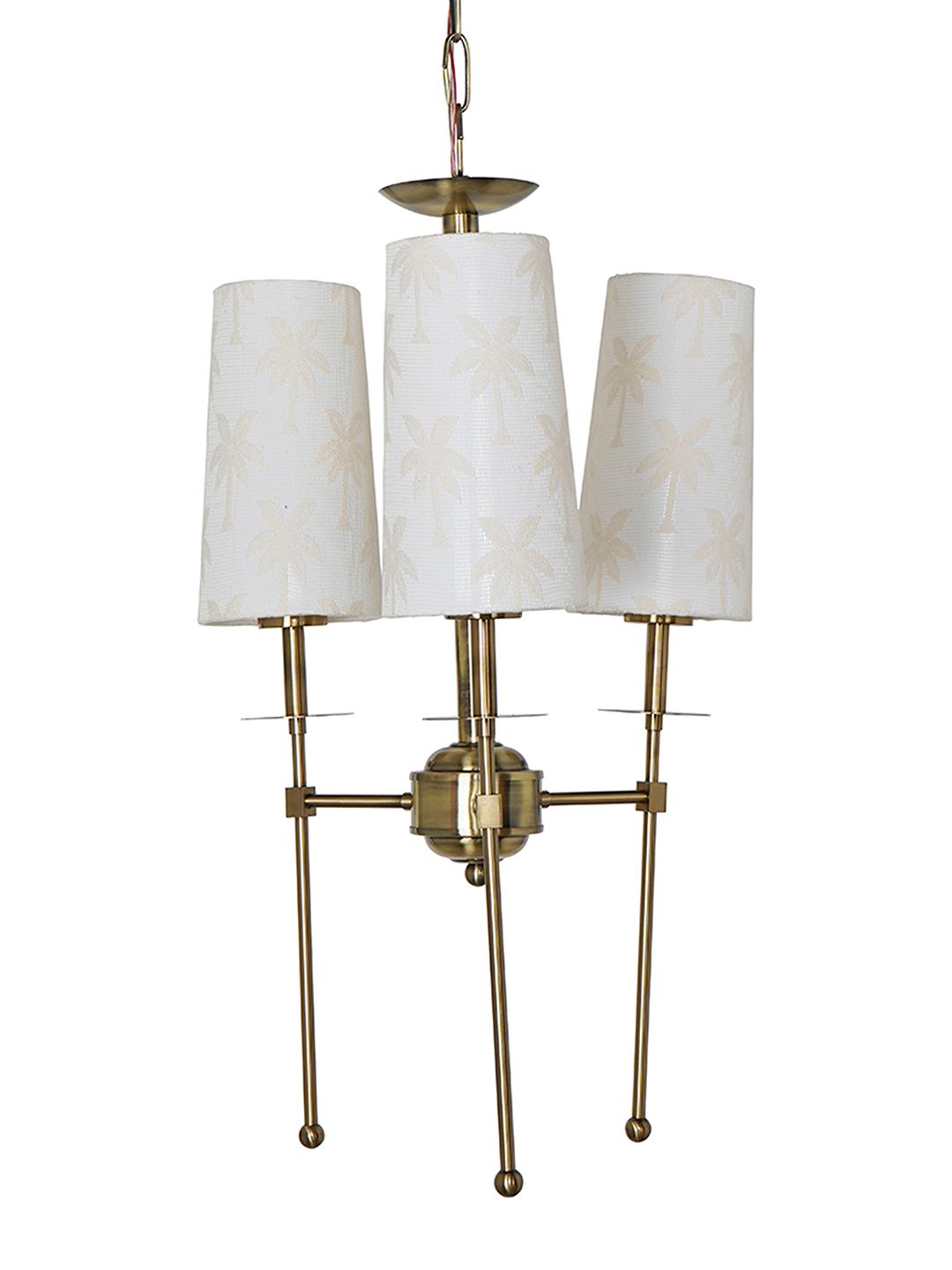 The LongArm835-Khajoor838-CH3 is a masterful blend of sleek modernism and organic texture. Designed as a compact 3-light chandelier, it features a 16-inch width that makes it an ideal statement piece for smaller dining nooks, entryways, or bedside lighting. Crafted from high-quality mild steel with a sophisticated antique brass finish, the design is characterized by its signature long straight arms, which create a striking vertical silhouette at 26 inches in height. Adding a touch of tropical luxury, the fixture is adorned with custom fabric shades featuring a Khajoor (Palm) self-design. This subtle tone-on-tone pattern diffuses light beautifully, casting a soft, inviting glow while adding a unique designer detail to your interior. Complete with an additional 10-inch chain for adjustable hanging, this contemporary chandelier is a versatile choice for those looking to add high-end tropical flair to a limited footprint.