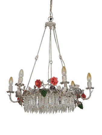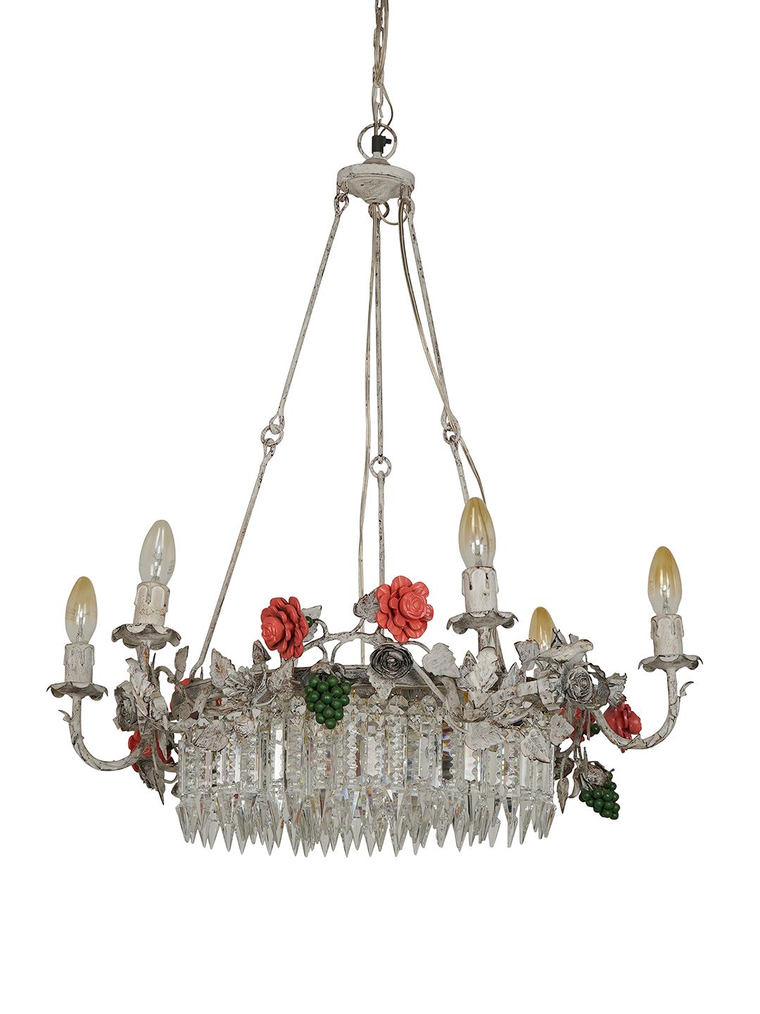 he SR3177-BirdPinkGreen-DIS0-CH6 is an enchanting Coastal and Rustic statement piece that brings the whimsical beauty of a blooming garden into your home. This 6-light chandelier features a substantial ring-shaped frame, meticulously crafted from mild steel and finished in a charming distressed white. The ornate design is suspended by three elegant rods and is adorned with intricate natural motifs, including hand-finished birds, delicate flowers, and clusters of grapes. Equipped with candelabra-style lamps, the fixture is further elevated by shimmering oil drop crystals that hang gracefully from the frame, refracting light to create a romantic, vintage ambiance. Measuring 27 inches wide x 27 inches depth x 28 inches height (68.58 cm W x 68.58 cm D x 71.12 cm H) with an additional 10-inch adjustable chain, this chandelier is the perfect centerpiece for Shabby Chic dining rooms, airy coastal living areas, or French country-inspired foyers.
