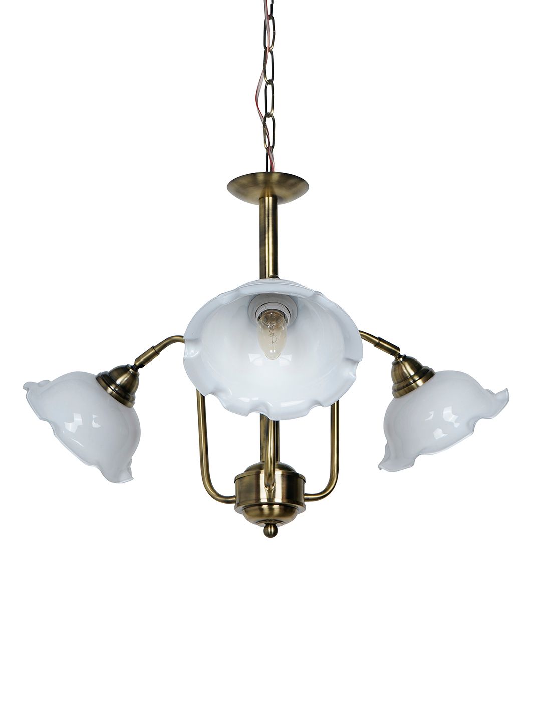 The Adjust-MS-BRSA-WhiteJhalar-CH3 is a versatile masterpiece that blends Vintage charm with modern-day functionality. This 3-light chandelier features a durable mild steel body finished in a warm antique brass, characterized by its distinctive gooseneck-shaped arms. Each arm is fully adjustable, allowing you to tilt and angle the shades to direct light exactly where it is needed—perfect for task lighting or creating a specific ambiance. The "White Jhalar" shades are the highlight of this piece, crafted from high-quality white glass with a delicate, frilled-edge "jhalar" design. These shades cast a soft, diffused glow that brings a romantic, nostalgic feel to any interior. Measuring 28 inches in width and 19 inches in height, this compact version is designed for smaller dining areas, cozy living rooms, or bedrooms. It maintains the same artisanal quality as its 6-light counterpart, providing a cohesive lighting solution for homes that appreciate retro-contemporary aesthetics.