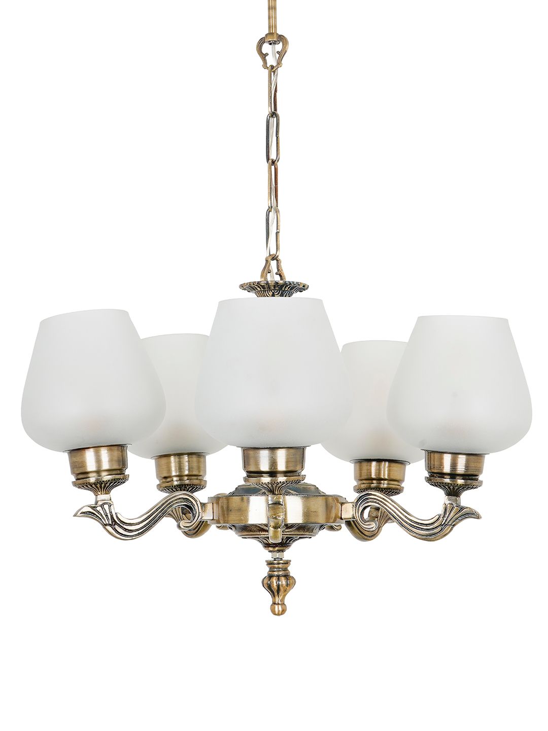 Make your living or dinning bright with this small, simple and alluring aluminium chandelier with plain frosted glass shade.