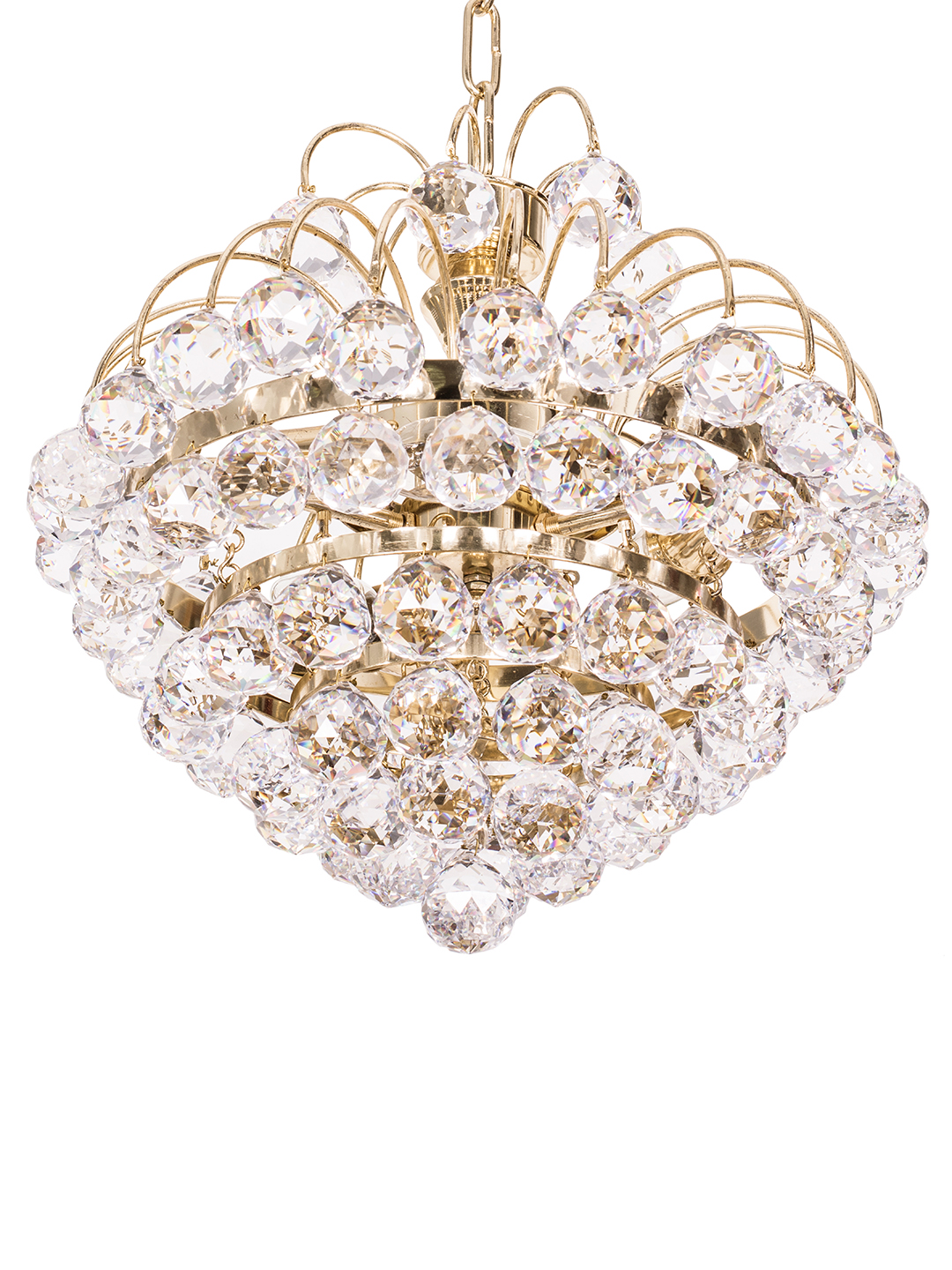 Add some opulence to your living space with crystal ball chandelier. This dynamic lighting element highlights a glinting polished and lacquered brass and generous rows of cascading crystals that catch the light. The chandelier is made of premium crystals that makes cleaning a breeze, just use a static duster or a dry cloth.Chandelier comes with a standard 10 inches brass chain and canopy, where the links could be removed to adjust the height.