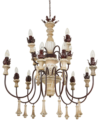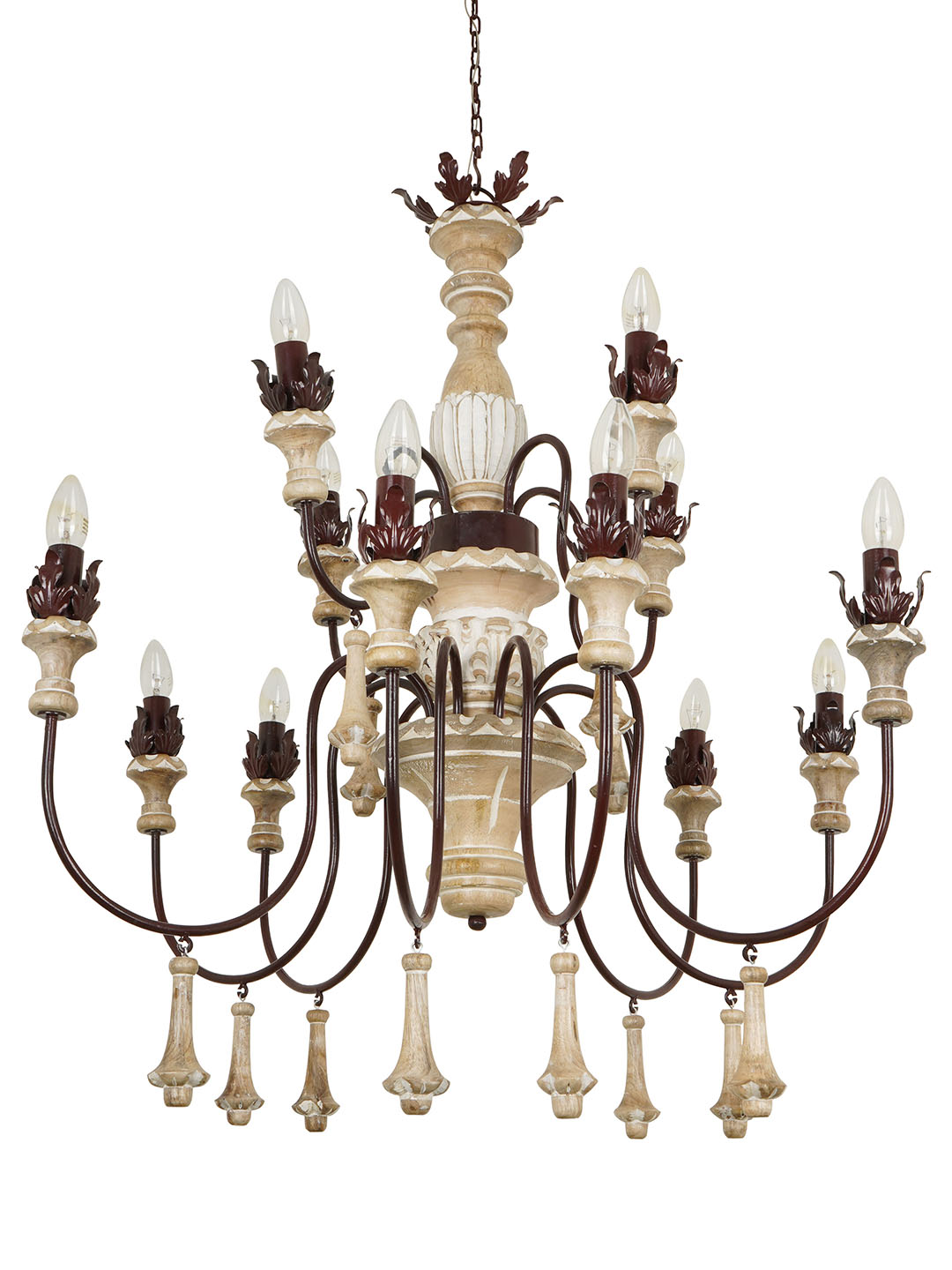 This wooden 12-light chandelier will add a surreal look to your decor. It is constructed from wood and features double tiered 12 lights, beautifully curved arms made of wrought iron along with dazzling carvings, bobeches, iron leaves and charming wooden hangings on each arm with a brown-creme finish. Its elegant rustic looks are best suited for a stunning entryway, dining room, or living room lighting.