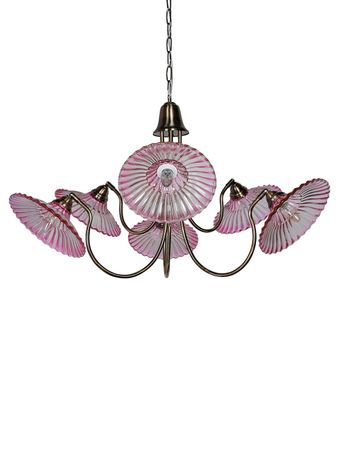 The Adjust-MS-BRSA-PinkJhalarPlate-CH6 chandelier is a vibrant, elegant statement piece designed for Transitional spaces that require a pop of color. This large fixture measures 40 inches W x 40 inches D x 24 inches H (101.60 cm W x 101.60 cm D x 60.96 cm H) and is constructed from durable mild steel and glass. It features six U-shaped arms where the angle of the shades can be adjusted, allowing you to customize the light direction. The defining characteristic is the set of captivating Gradient Pink colored frilled-edge glass shades—the beautiful fluting and soft pink hue add a touch of playful sophistication. Ideal for dining areas, lounges, or large entryways, it includes an additional 10 inches of chain for flexible hanging.