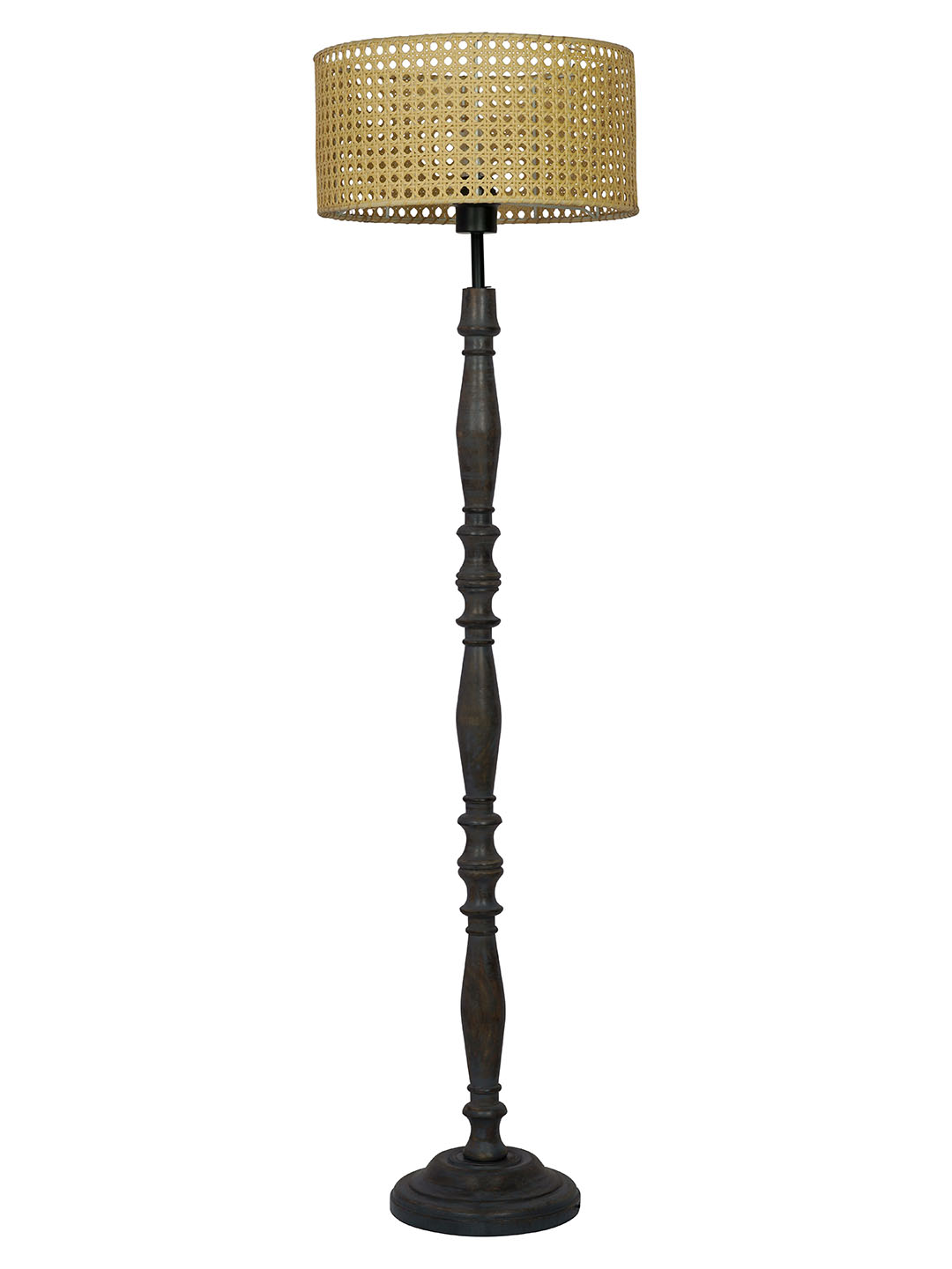 A unique & elegant patterned pedestal lamp that totally stands out because of its beautiful hand-carved sturdy base in distress grey finish and a natural-finished cane drum shade with classic patterns crafted by skilled artisans. This farmhouse-style lamp will create an absolutely relaxing atmosphere for your home. A warm, bright illumination is radiated from the handwoven shade, ideal for a rustic setting, & will brighten any dull corner of your house.