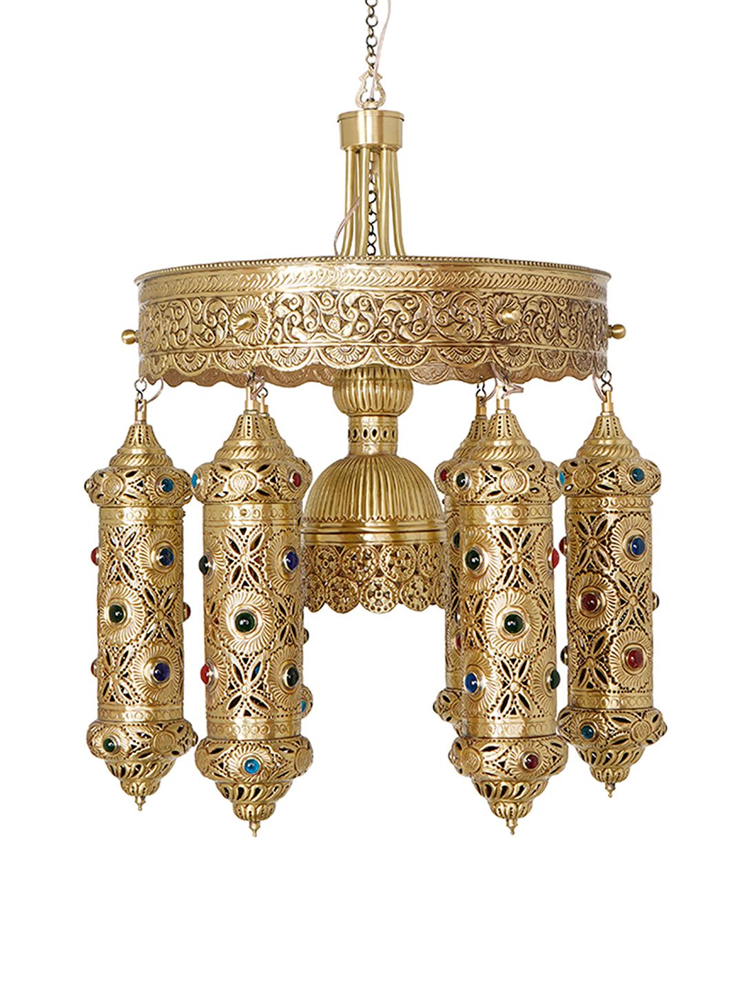 The CarvingPlateCylinders-BR-BRSA-HL6+1 is an authentic piece of artisanal lighting, 100% handcrafted from premium brass with a rich antique brass finish. Standing 27 inches tall and 22 inches wide, this Moroccan-style chandelier features a central carved drum plate from which six tubular pendants descend, elegantly balanced by a seventh light source housed in a central cup. Every inch of the brass cylinders and the main drum is adorned with intricate, hand-carved patterns and pierced detailing. To add a vibrant, jewel-toned touch, each cylinder is embedded with colorful glass beads that sparkle with light, casting enchanting, kaleidoscopic patterns across your walls. Complete with a 10-inch heavy-duty chain for adjustable hanging, this 7-light fixture is the ultimate statement piece for a bohemian living room, an exotic dining area, or a high-end spa reception seeking a warm, cultural glow.