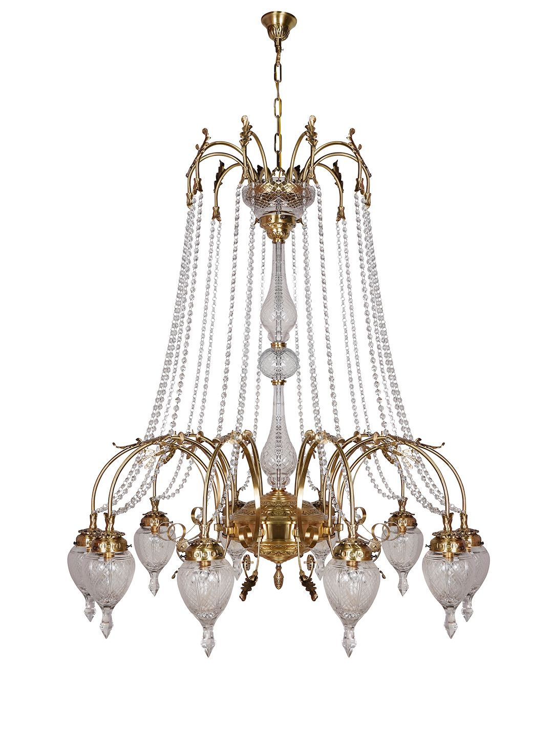 Elevate your interior with the Antique Brass Chandelier, a masterpiece of traditional craftsmanship designed to be the focal point of any grand room. This opulent 10-arm fixture features a rich antique brass finish meticulously embellished with delicate, hand-cast brass leaves that wind along its sweeping arms. The chandelier showcases a stunning cut-glass central column and ten downward-facing shades made of high-quality cut glass, providing a warm, diffused glow. Adding to its regal silhouette, shimmering crystal strands drape gracefully from the smaller top arms to the larger primary arms, creating a waterfall effect of light and reflection. Premium Materials: Expertly crafted from solid brass, precision-cut glass, and radiant crystals. Grand Scale: Measuring 44 inches in diameter and 50 inches in height, it is perfectly suited for foyers, ballrooms, or formal dining areas. Classic Detailing: Features downward-facing shades for direct yet soft illumination and a 10-inch adjustable brass chain for customized hanging.