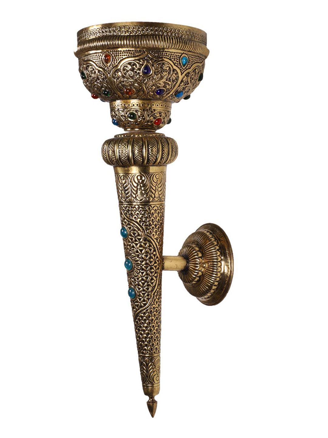 This torchiere mashal wall light is hand made by skilled artisans with brass and studded with faux gemstones. Give a regal look to your house by hanging two on either side of the entrance, balcony or passage