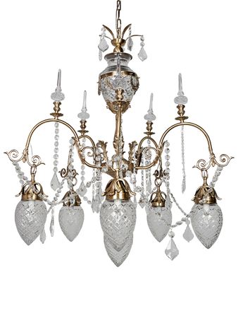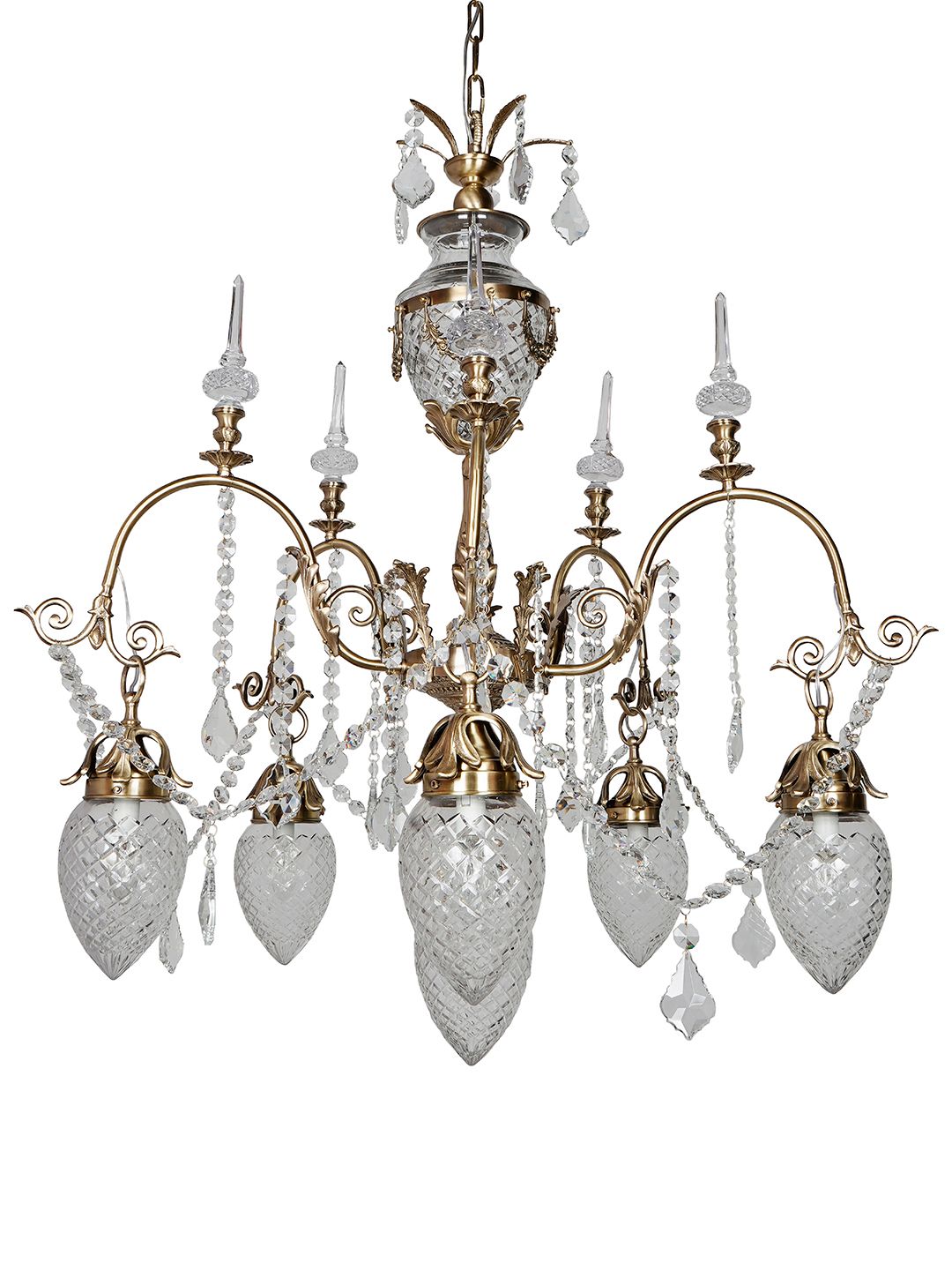 The DevBhallaDown-Cutglass-BR-CH5+1 is an opulent and magnificent statement piece, embodying the height of Traditional lighting design. Measuring a grand 39 inches W x 39 inches D x 41 inches H (99.06 cm W x 99.06 cm D x 104.14 cm H), this chandelier is ideal for luxury ballrooms, grand halls, and large dining areas, with an extra 10 inches of brass chain for flexible installation. The core structure is made of delicate cast brass in an antique brass color, richly adorned with intricate crystals and cut glasses. The light configuration includes four arms that terminate in unique downward-facing cut glass shades. Each arm is further embellished with an obelisque crystal facing upward at the curve, adding vertical dimension. The central column features a decorative cut glass trophy glass element, exquisitely detailed with a brass Kotinos design. The fifth light is strategically positioned at the center, facing down to maximize illumination. This piece is the ultimate definition of luxurious, traditional lighting.