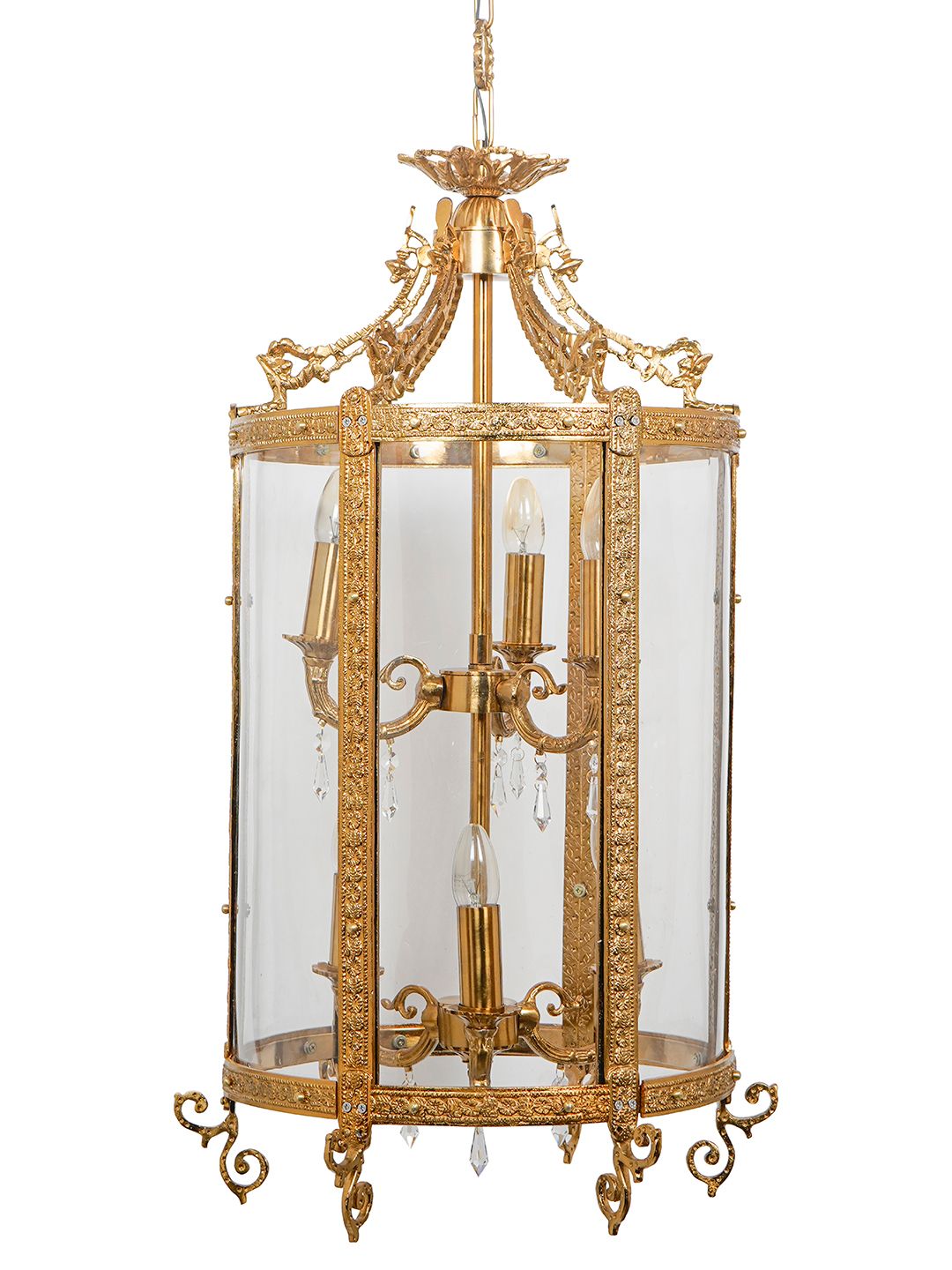 The Alu-Lantern-Carving-HL3+3 is a majestic lighting masterpiece designed for those who want to capture the essence of old-world royalty with modern engineering. Standing at an impressive 32 inches in height, this long cylindrical lantern is crafted from high-quality aluminium and finished in a sophisticated matt brass. The body is adorned with deep, ornate carvings that showcase exceptional craftsmanship, making it a focal point even when the lights are off. What truly sets this pendant apart is its interior: rather than a single light source, it houses two small 3-light chandeliers stacked vertically. This "3+3" configuration ensures a brilliant, multi-level glow that fills the entire 18-inch diameter frame. For your peace of mind, the side panels are made from clear acrylic rather than heavy glass; this provides the same sparkling clarity but makes the fixture lighter to install and far easier to maintain over time. Suspended by a matching ornate chain, this lantern is the perfect choice for grand entryways, palace-style foyers, or upscale hotel lobbies.