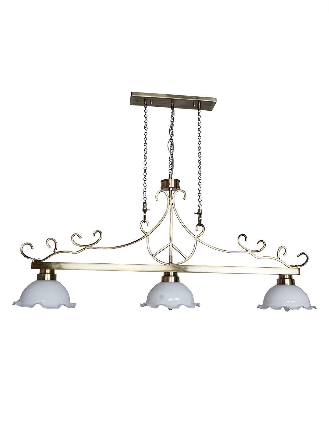 The Pool-MS-BRSA-WhiteJhalar-HL3 is a stunning Transitional linear pendant designed to bring a touch of retro elegance to elongated surfaces. Measuring 40 inches wide x 8 inches deep x 29 inches high (101.60 cm W x 20.32 cm D x 73.66 cm H), this fixture is specifically crafted for placement over kitchen islands, breakfast counters, or pool tables. It features a durable mild steel frame that supports a series of beautiful white glass shades characterized by their unique retro frilled edges. The crisp white glass provides a clean, bright aesthetic while the frilled detailing adds a soft, vintage charm. This hanging light offers even, widespread illumination, making it a perfect functional and decorative focal point for modern and classic interiors alike.