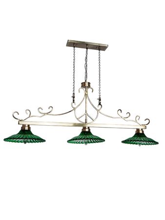 The Pool-MS-BRSA-GreenJhalarPlate-HL3 is a sophisticated Transitional linear pendant designed to provide elegant, widespread illumination over elongated surfaces. Measuring a substantial 43 inches wide x 10 inches deep x 29 inches high (109.22 cm W x 25.4 cm D x 73.66 cm H), this fixture is the ideal choice for lighting up a kitchen island, breakfast counter, or a professional pool table. It features a durable mild steel frame with a warm antique-inspired finish, supporting a series of stunning fluted glass shades. These shades transition through a gradient green palette, combining a modern ribbed texture with a refreshing botanical hue. The result is a soft, diffused downward glow that adds both character and high-end style to any contemporary or traditional interior.