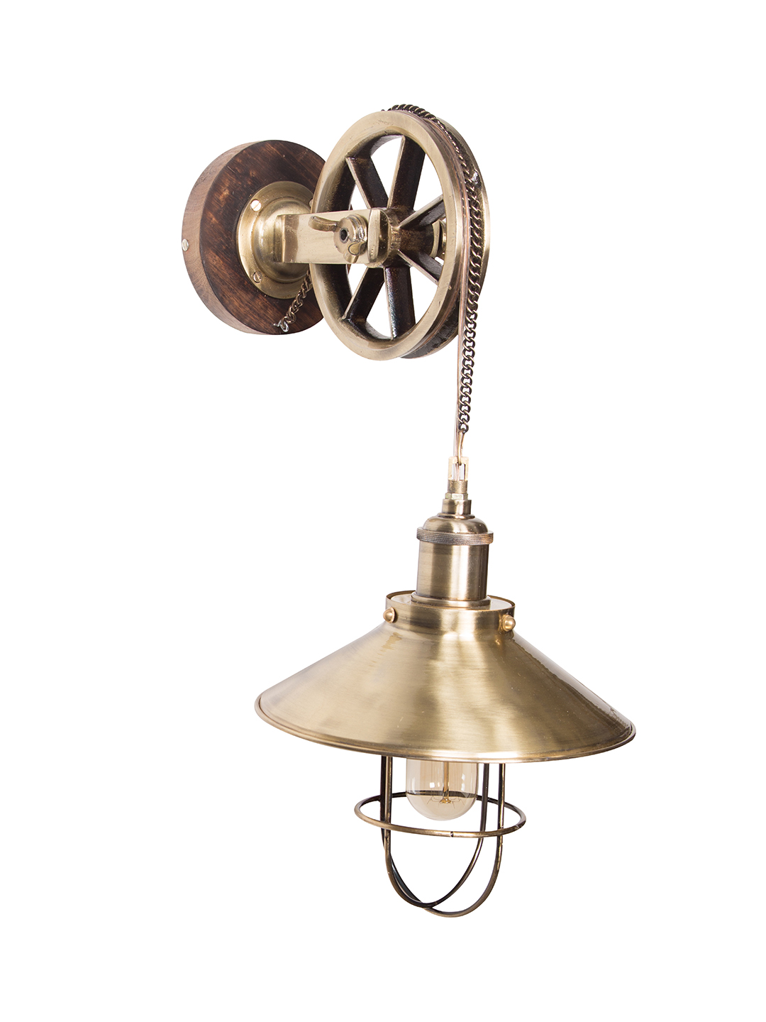 Hand crafted barn pulley wall light with a beautiful wooden base and steel frame in antique brass finish gives a unique industrial style feel to any residential, retail or commercial space.