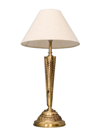 Conical brass table lamp with ornate hand tooled design with cotton shade makes an excellent addition to any transitional decor. Set it in an office, dining room or on a console for a bold and stately look.