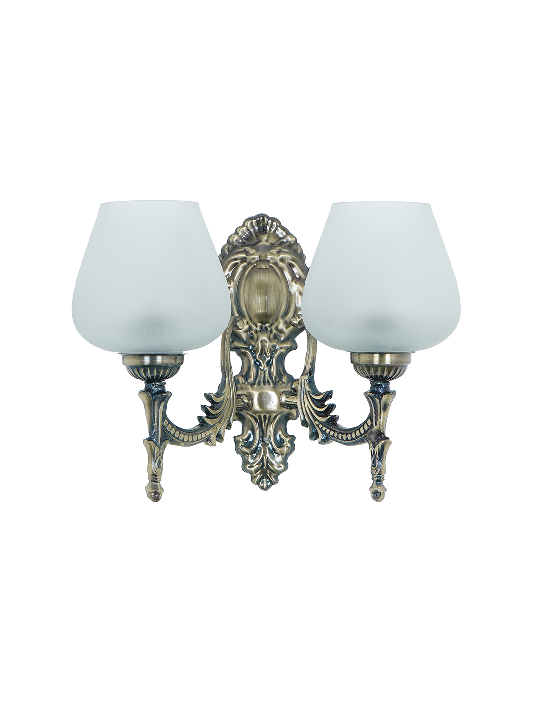 This wall lamp brings along a classic aura and a sturdy & robust hand-carved mild steel base in an antique brass finish. It has ornamental arms, bobeches, and two lights covered with plain frosted goblet glass shades that serve as a great source of illumination throughout the area and level up the decency threshold of any traditional decor-style home.