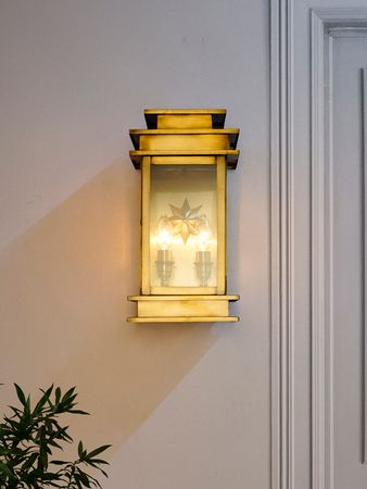Add a touch of vintage glamour to your home with this stunning Art Deco wall sconce. Crafted from brass with an antique brass finish, this fixture features a geometric silhouette and clear glass panels, showcasing the intricate star detailing within. The warm glow of the light creates a sophisticated ambiance, perfect for hallways, entryways, living rooms, or bedrooms.