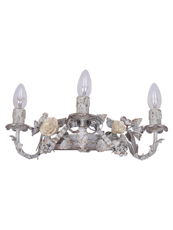 This Distressed White Rose and Bird Wall Sconce brings French country romance to your home. This half-ring-shaped wall light features delicate ivory ceramic roses, metal birds, and twisting grapevines, all finished in a distressed white for a charming, vintage look. Three candelabra-style bulb holders complete the design, providing a soft and elegant glow. Perfect for bedrooms, hallways, or dining areas seeking a touch of rustic charm.