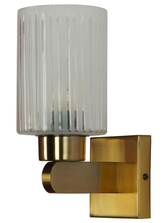 A single-light gold wall lamp made of mild steel in an antique brass finish with a hand-cut vertical striped cylindrical glass shade and a square base perfectly suitable for transitional home decor. A couple of these fixtures can uniformly spread a bright luminescence all over the place exuding a warm aura & calm atmosphere. It can be a great decoration piece for your bedrooms, living rooms, study, or corridors.