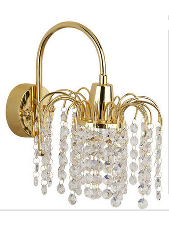 Featuring a radiant golden finish and finely cut premium grade Asfour brand clear crystals this elegant wall sconce light will give any room sparkle and glamour.