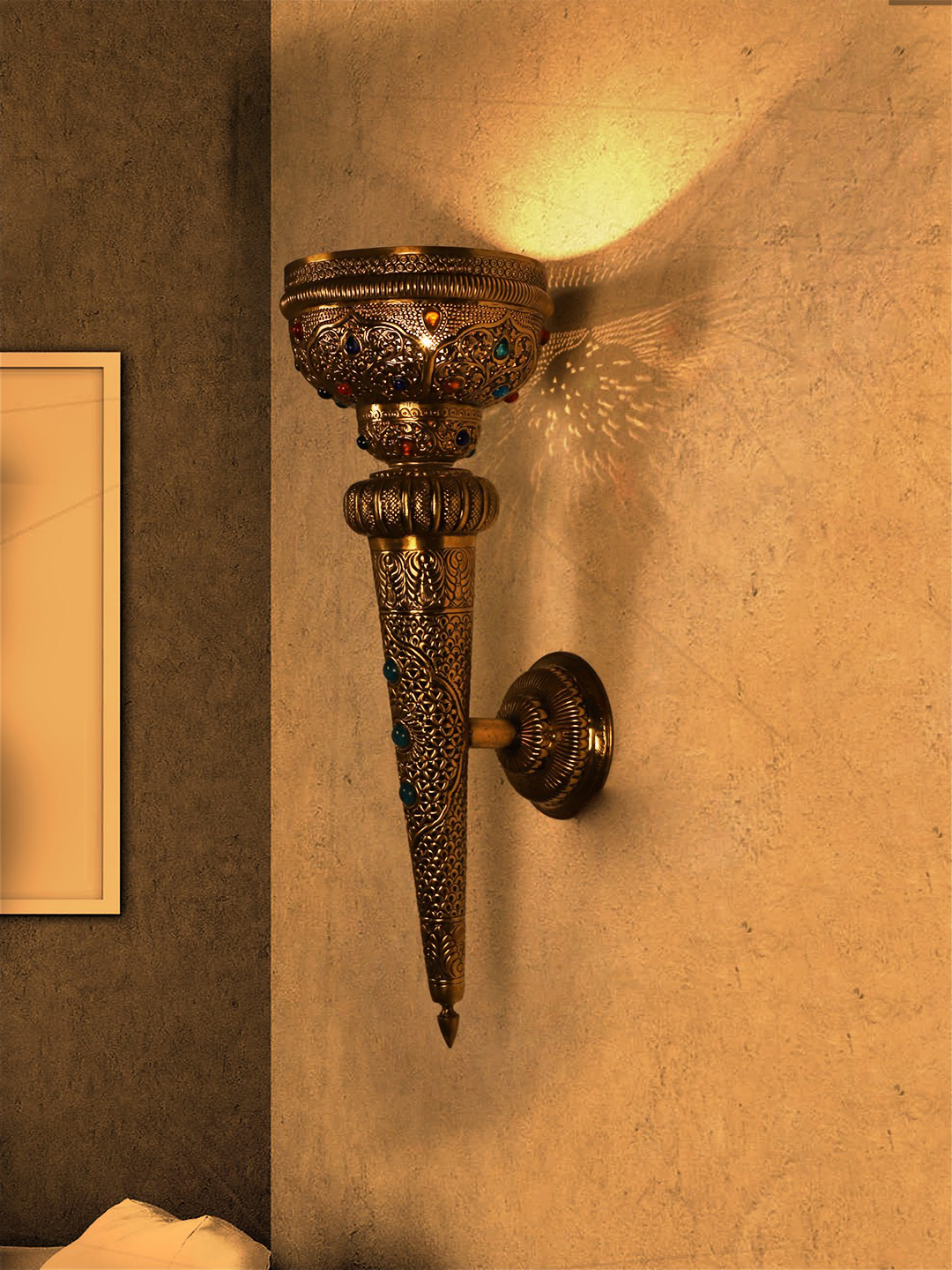 This torchiere mashal wall light is hand made by skilled artisans with brass and studded with faux gemstones. Give a regal look to your house by hanging two on either side of the entrance, balcony or passage