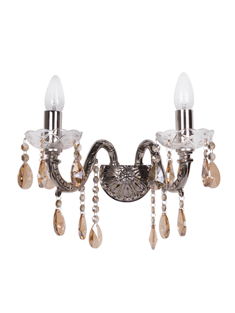 Stunning 2 light crystal wall sconce with fine honey crystals gives sparkle to a brilliant evening at palaces and manors. This brass wall light in an antique nickel finish is draped with crystals that capture and reflects light of the candle bulbs resting on a cut glass bobeche.