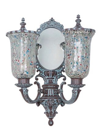 Enrich your home’s ambiance with the PatinaMirror-SamaToughClear9-WL2, a stunning 2-light wall sconce that epitomizes traditional luxury. Crafted from durable cast aluminium with a hand-finished bronze patina, this piece features a built-in mirrored base that reflects light to create a richer, more expansive glow in your hallways or living areas. The standout feature of this sconce is its dual light sea-green crackled mosaic glass shades. Each shade is crowned with a decorative lid, a signature design element of the Patina Mirror series that adds an ornate touch while serving the practical purpose of preventing dust accumulation for low-maintenance elegance. Measuring 16 inches wide and 22 inches tall, this sconce provides a majestic presence that ties together the look of your interior lighting.