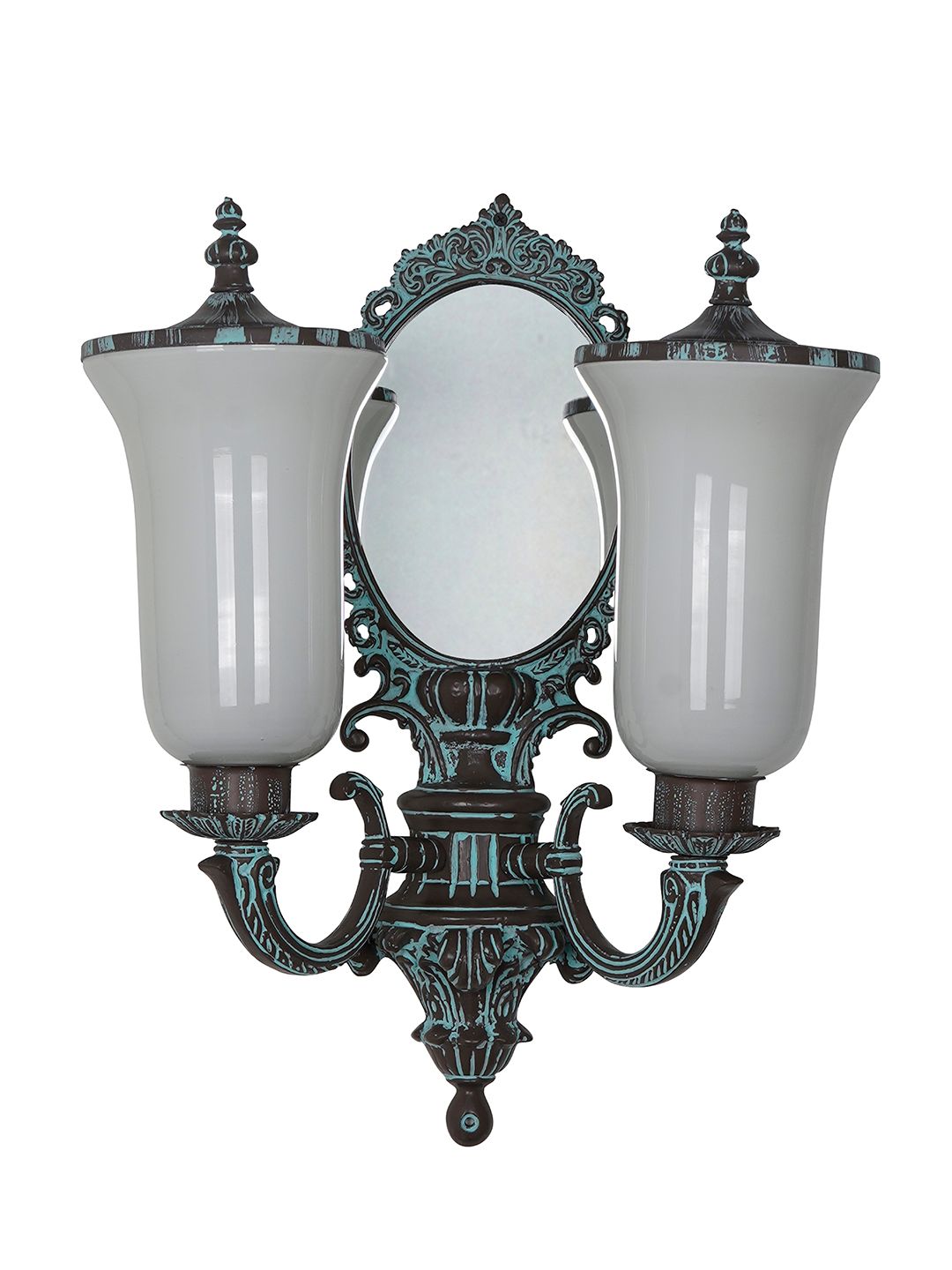 The PatinaMirror-SamaMilky9-WL2 is a masterpiece of classical lighting, designed to bring a sense of regal history to your walls. Standing 22 inches tall, this 2-light sconce is expertly crafted from cast aluminium with a sophisticated bronze patina finish. The centerpiece of the fixture is a high-quality integrated mirror backplate, which reflects the glow of the two lights to create a richer, deeper sense of space and traditional opulence. Each light is housed in a vintage milky white glass shade, topped with a custom-fitted decorative metal lid. These lids serve a dual purpose: they complete the ornate "trophy" silhouette and significantly reduce maintenance by preventing dust from entering the glass shades. Spanning 16 inches in width, this sconce is the perfect companion to the "Sama Milky" series chandeliers, making it an ideal choice for flanking mirrors in a grand hallway, anchoring a formal dining room, or adding heritage charm to a luxury master suite.